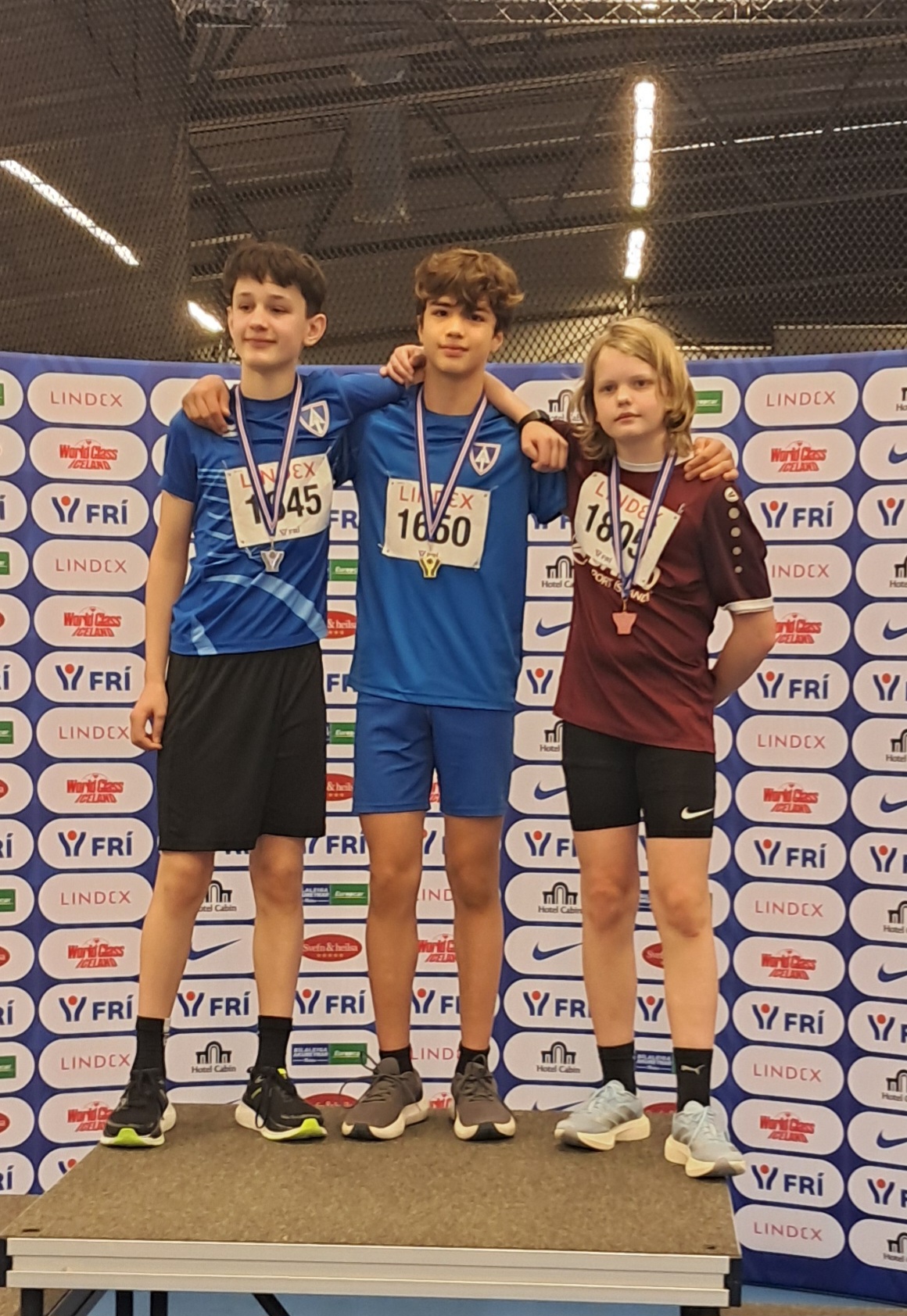 Hilmir Dreki á verðlaunapalli með bronsverðlaunin fyrir kúluvarp í flokki 11 ára pilta